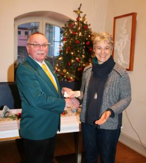 Sr. Katharina, Generaloberin der Oberzeller Franziskanerinnen, freute sich sichtlich über die 1.020 €, die ihr Günter Führich, 1. Vorsitzender des Musik- und Gesangvereins Zell a. Main, überreichte.