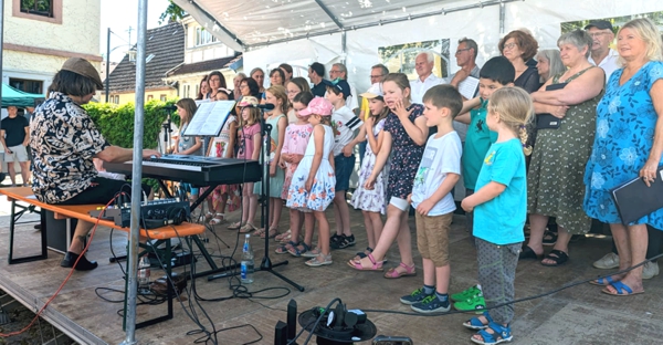 Danach gab es eine Premiere: Der im März gegründete Kinderchor kam im Entengang auf die Bühne mit dem Wüstensong. Die zahlreichen Zuhörer waren sofort dabei und sangen mit: „Na-na, na, na, na...“. Mit vollem Körpereinsatz gaben die Kinder im Alter von 5 bis 10 Jahren ihr Bestes, sei es beim „Schnakenrock“, bei „Schulbus“ oder „Ferienzeit“ – die Zuhörer waren begeistert! Chorleiter Wurm moderierte zudemalles sehr humorvoll.